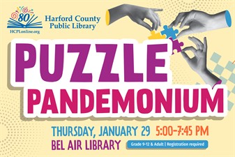 As part of Winter Reading 2026, Harford County Public Library presents Puzzle Pandemonium January 29 from 5 to 7:45 p.m. at the Bel Air Library, 100 East Pennsylvania Avenue. If you love puzzles, this event is for you. Work together in a small group to complete a puzzle. The first group finished wins a prize. Each person attending must register prior to the program at https://programs.hcplonline.org/event/14821822. The program, for those in grade 9 through adult, is supported by the Bel Air Friends of HCPL.