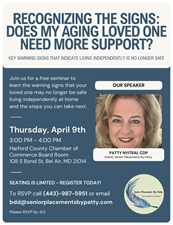 Connor Hanley Join us for a free seminar to learn the warning signs that your loved one may no longer be safe living independently at home and the steps you can take next. If you've ever asked yourself “when will I know it’s time to think about assisted living for my loved one?”, this seminar is for you! Patty Nyitrai, owner of Senior Placements by Patty, will be discussing the many factors that can contribute to making the decision that "it's time".